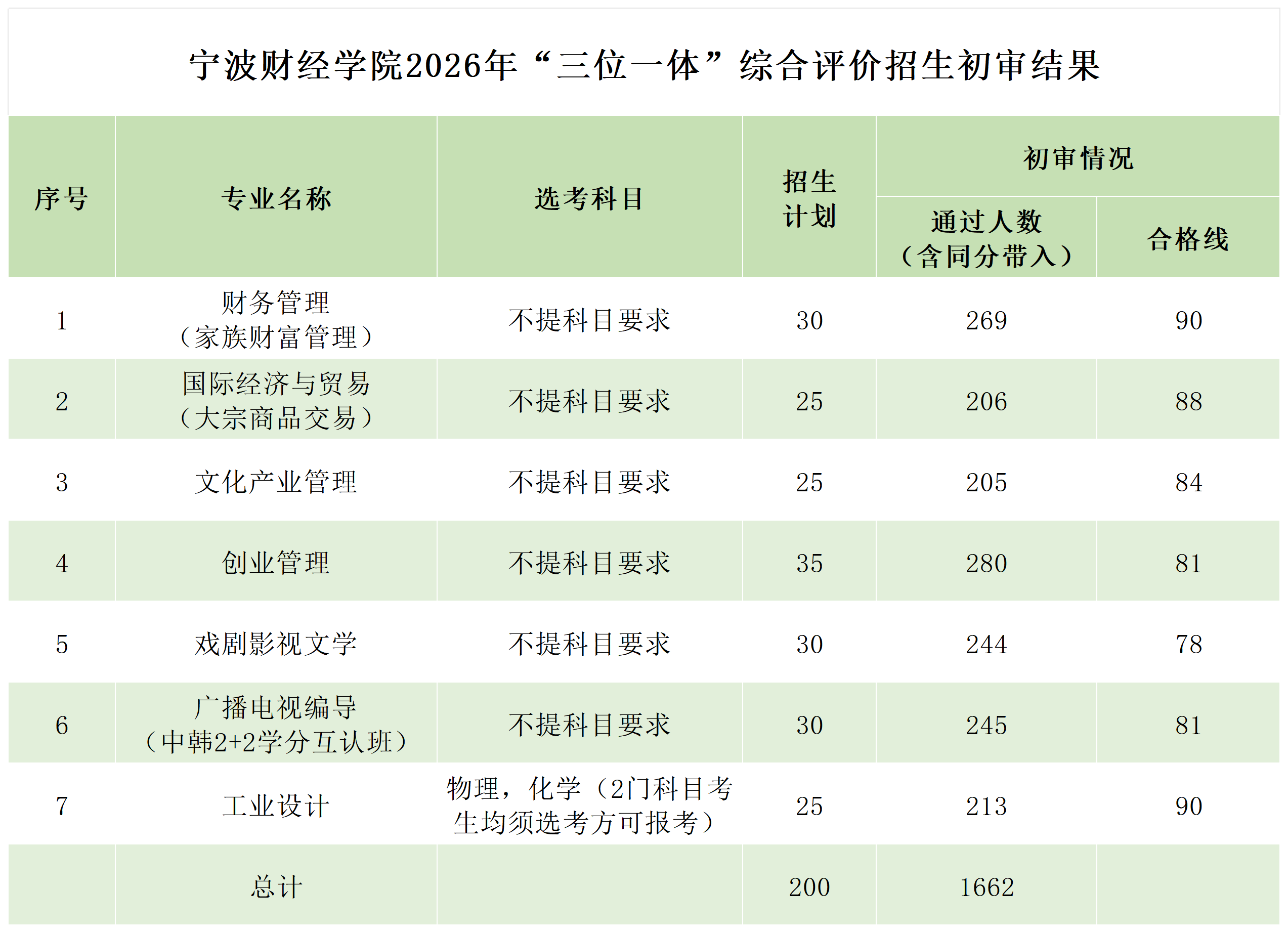 我校2026年“三位一体”综合评价招生计划200人,根据浙江省教育考试院相关文件要求和《宁波财经学院2026年“三位一体”综合评价招生章程》规定,对网上报名的7673名考生的报名资格进行了审核,按照学考赋分从高到低排序,以各专业招生计划数8倍的比例确定初审合格线和初审通过名单,同分考生一并划入。经学校“三位一体”招生工作领导小组审议,共有1662名考生通过初审,获得综合素质测试资格,现将通过初审的考生名单予以公示(具体名单见附件),考生亦可登录我校“三位一体”报名系统查询初审结果。